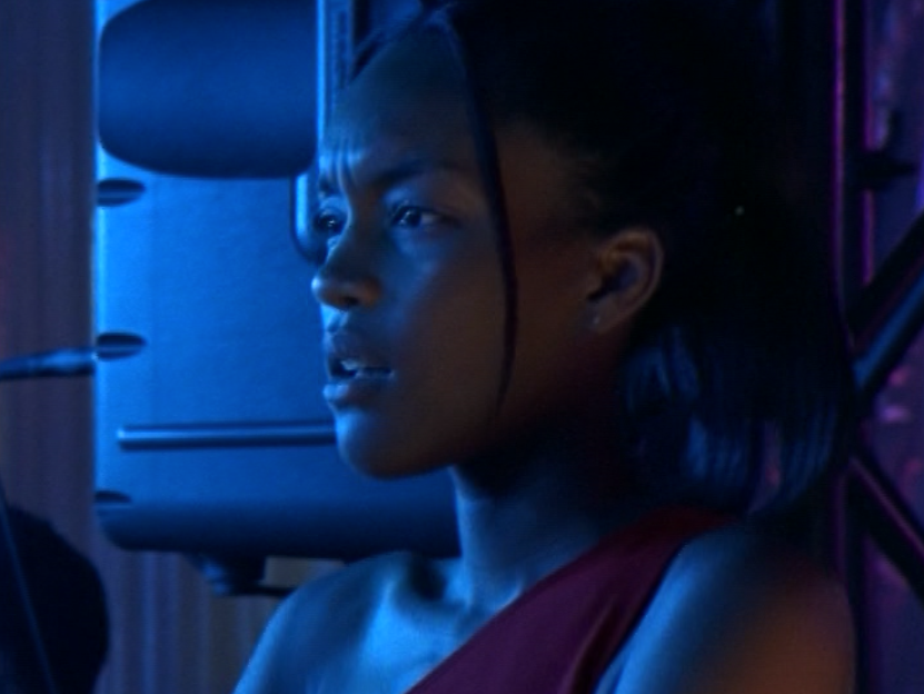 We are gathered here in Spike’s macaroni orange home to view her ensembles for this episode. First she wears her hair either slicked back or combed back, and a scoop neck tee with half-length sleeves. And I’ll always remember her Elvis Costello outfit. I think I was like, an actual fan of it back in the day. It’s a set of matching shirt and pants. The shirt is a very pale blue ribbed tank that has this zipper down the front, and whatever you call this kind of neckline I don’t know. Then the pants are almost 70s-reminiscent, khaki and flared with a stripe down the leg in that matching blue color. I thought it was super cool. Oh god, I just realized, my last Snake post where they are making out at the end, that’s after the concert. Spike wore this cool getup to go the concert and Snake literally wore a teaching outfit. OMG.