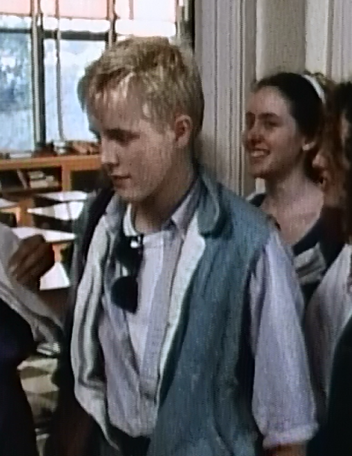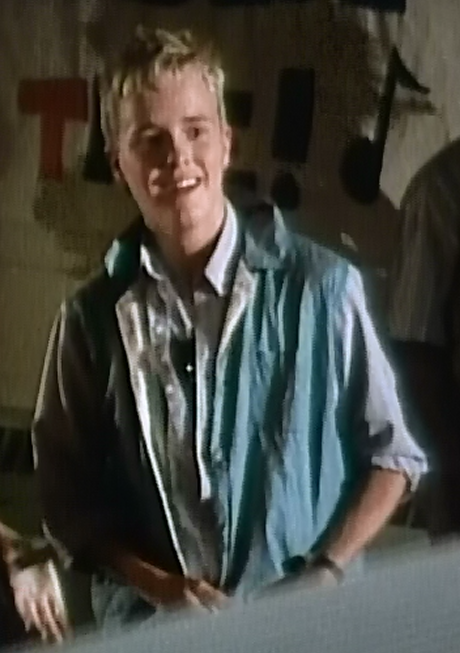 In both of Simon’s ensembles shown here, he’s got on 3 layers, and it actually looks like 4 layers! The usual formula is a white tee, a partially unbuttoned button down, and then a grey sleeveless unbuttoned button down over the top. The final requirement is a cool pair of spring break sunglasses tucked into the front of his white tee collar. And let’s talk about his hair for a moment. I presume this was before the “spiking” of the 90s became a thing, so I suppose this is more of a “bed-head” look.