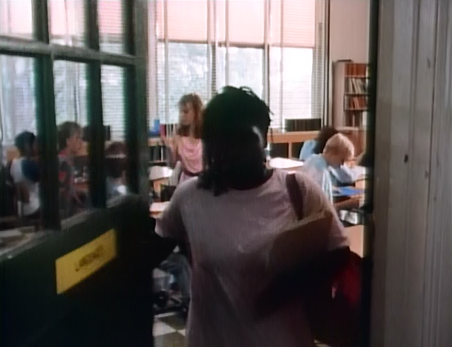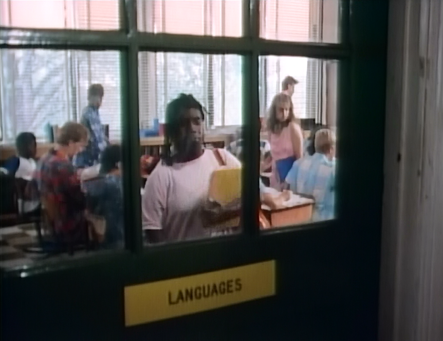 I’ve been working on my pause-button skills and got a few Joy caps for you this episode. As always, she’s the first person to rush out of class. She must hate class. Or she must have a boyfriend she really wants to get to in between classes. Anyway, I swear t-shirts are getting bigger. Soon they will look like mu-mus. You know, like that flowered one Homer Simpson wore. Anyway, despite the enormity of this pink shirt, it looks cute with teal shorts and white flats.