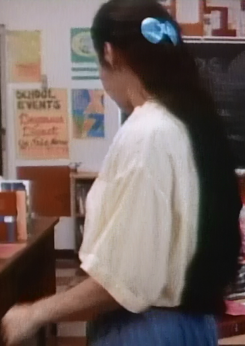 And finally, we close with Avery’s attire for Quest for the Best. I totally love this, it looks incredibly comfortable. Actually, she’s dressed a lot younger today, more like a student. Long flowy blue peasant skirt, and an oversized yellow button down. Lovely.