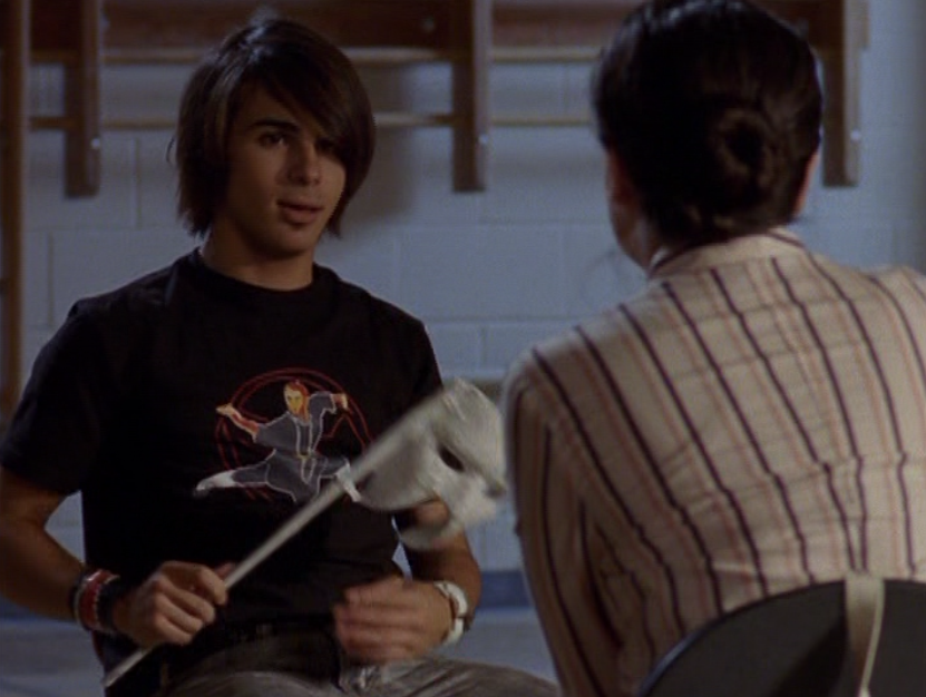 Marco is Manny’s companion in this episode. I kinda like them as friends but it never really gets to take off, due to Paige. So he’s rocking the long hair with the side part, which I probably compliment every time I post it. He first wears a tee under a button down and with jeans. Then in yoga he wears his man capris, a tank, and a bandanna. At the assembly he wears a tee and a beanie. But come on, let’s get to the REAL outfit here. For the dance, he wears this amazing red fedora with a matching red tie and a black longsleeve. It’s really a cool look. It’s like he took some inspo from Manny here.