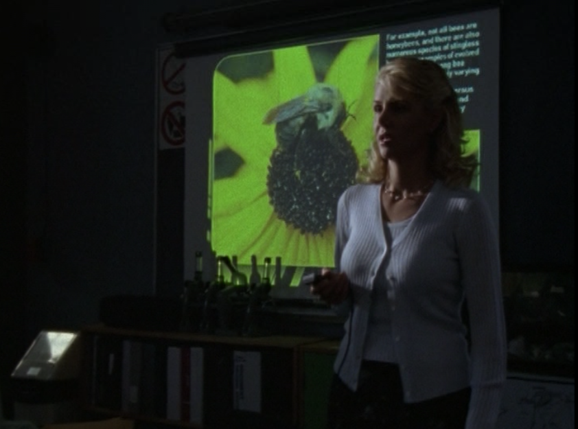 Ms. Hot Sauce is wearing a matching tank & cardi set in an indiscernible color as she teaches us about bees.