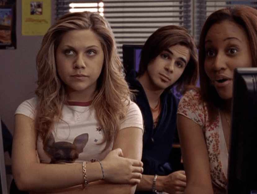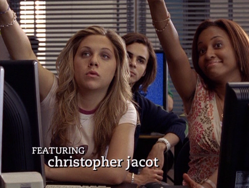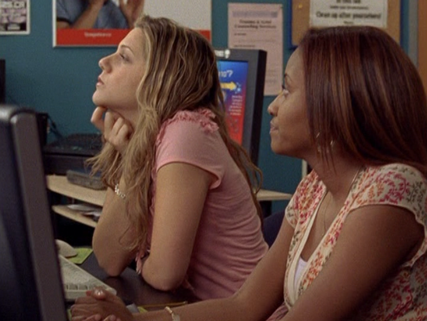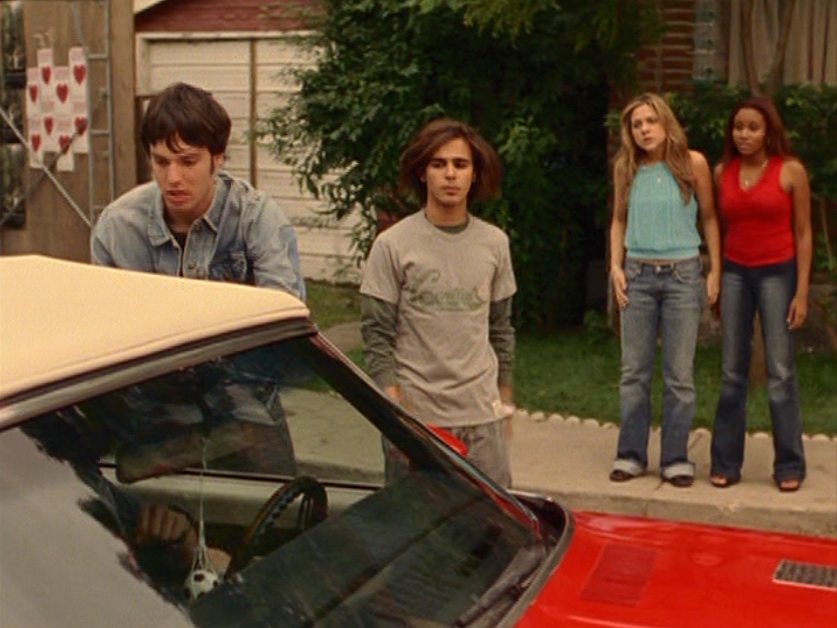 Like Amy & Allison from ye olde Degrassi High days, maybe I should have combined Hazel & Paige’s outfits this episode. Anyway, like I already said in my Hazel post, I adore these blue and red tops together – they make such a cute combo! Paige’s hair is styled like always, eyebrows skinny, and she wears a sky blue halter-like top with that elastic hem at the bottom and low-rise, cuffed jeans. How come Paige’s jeans always have to be cuffed but Hazel’s don’t?