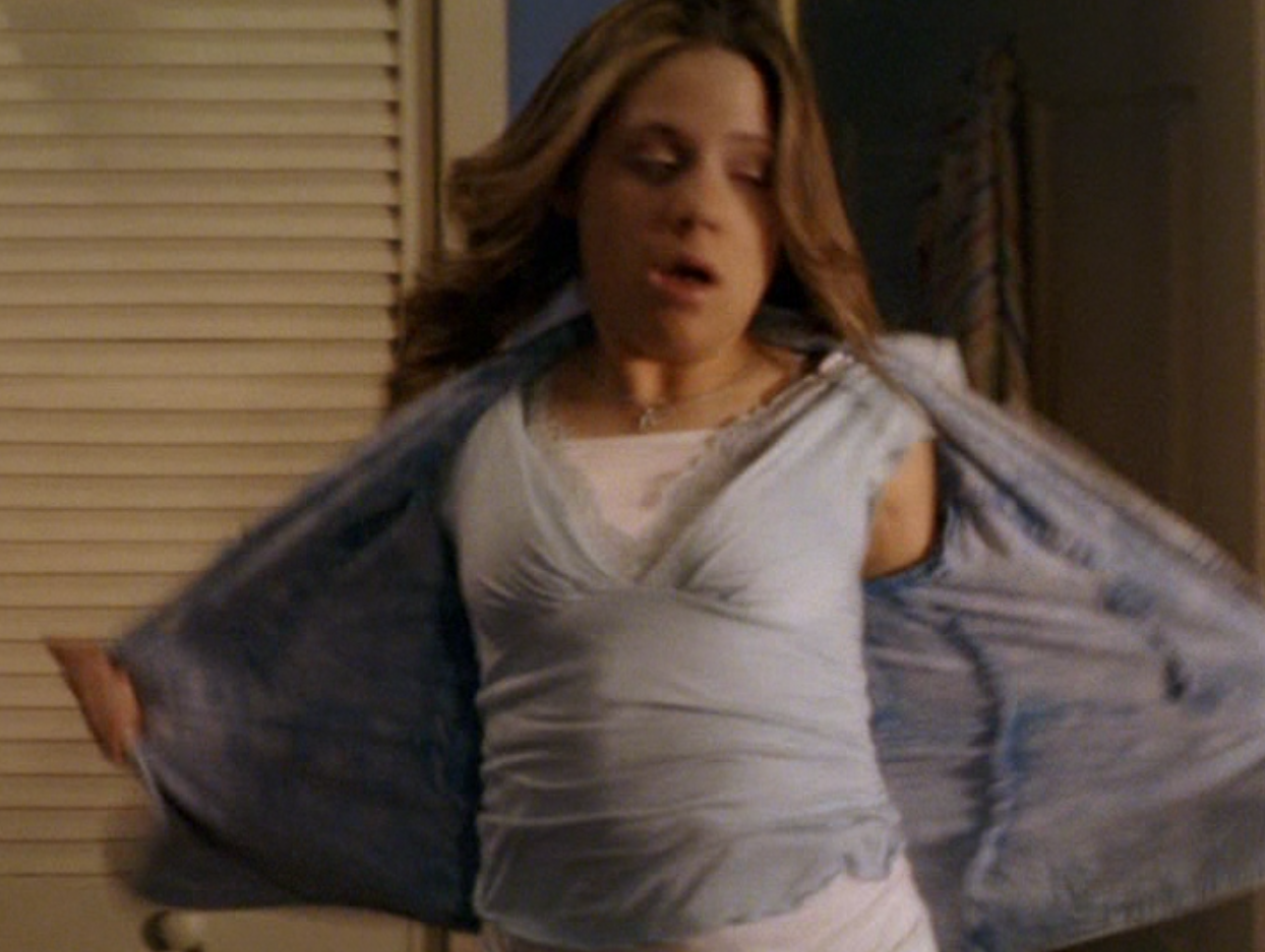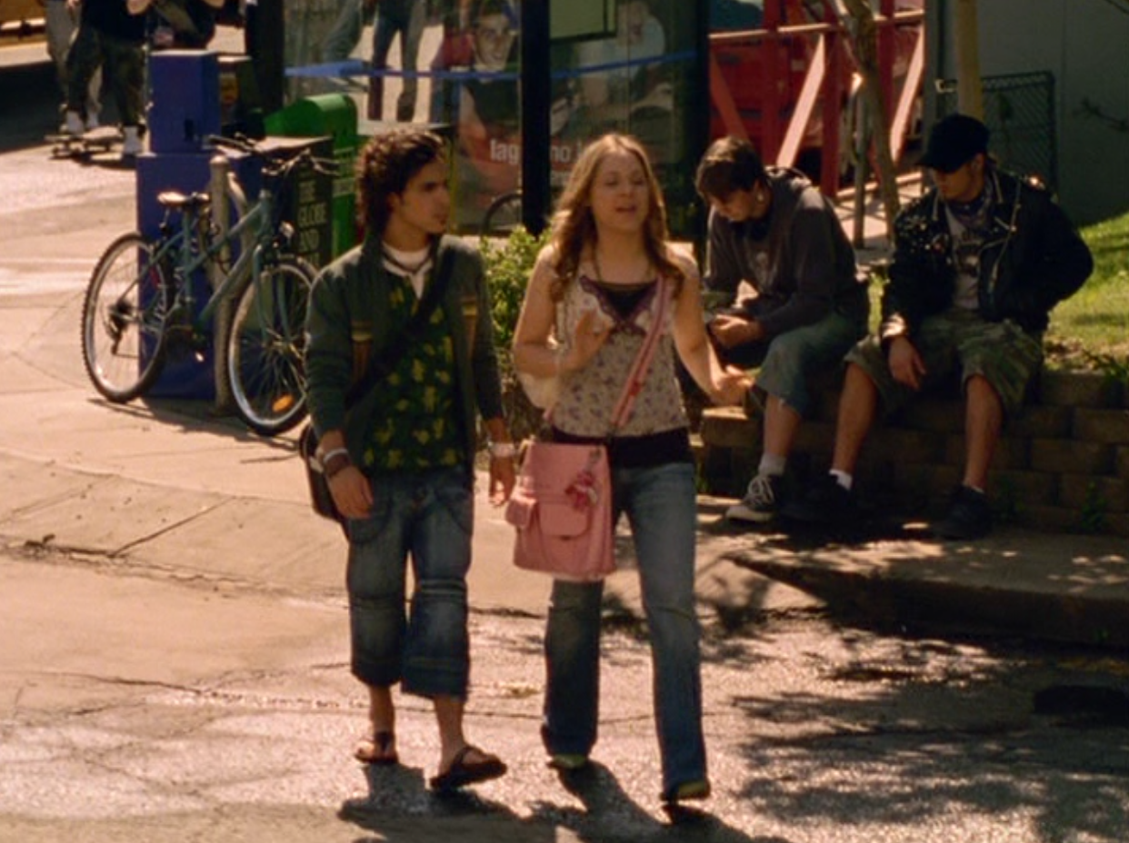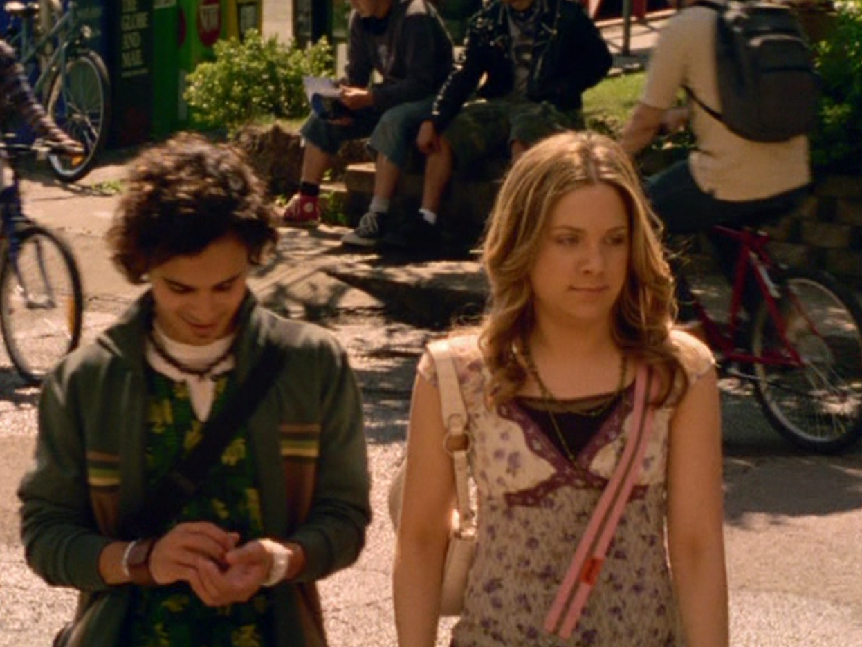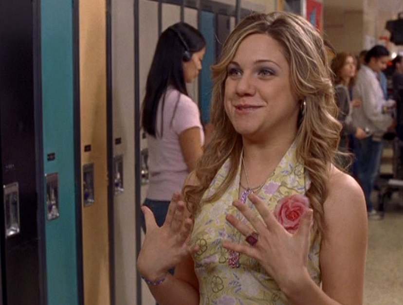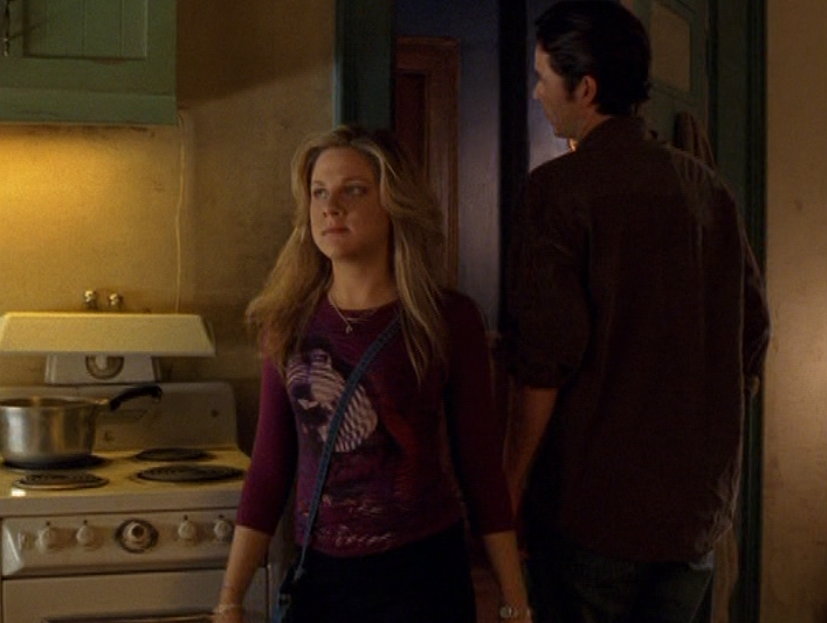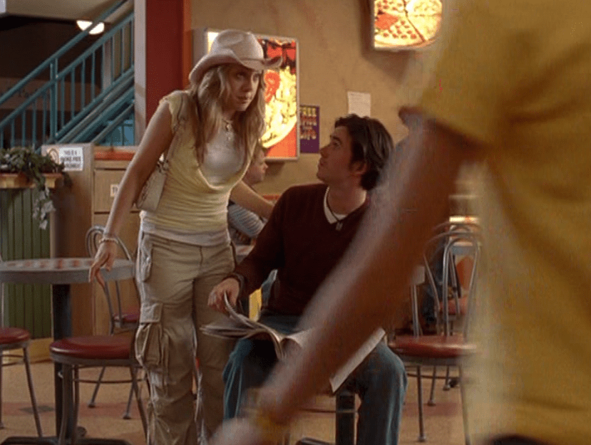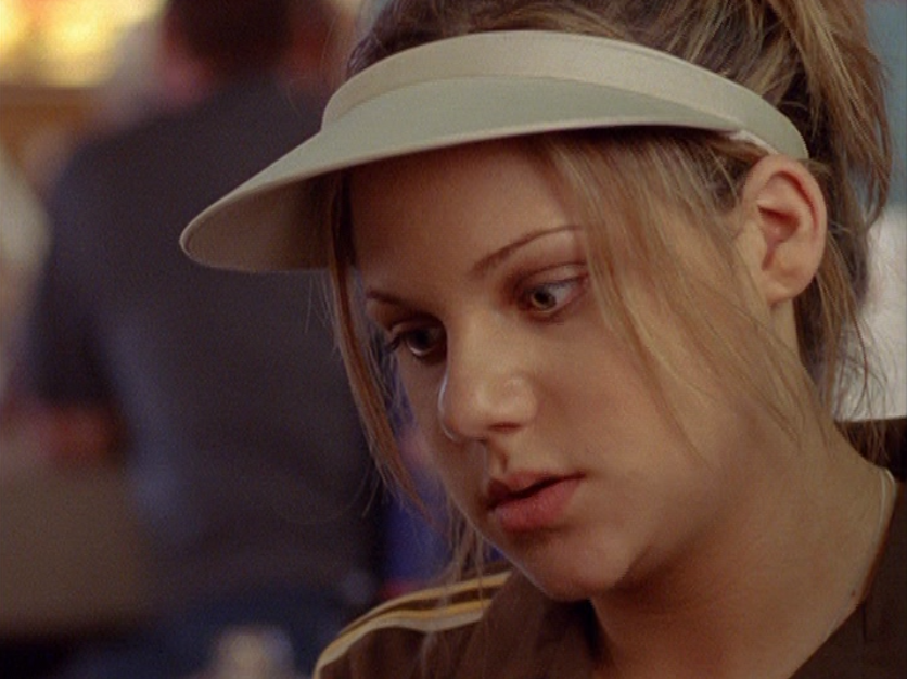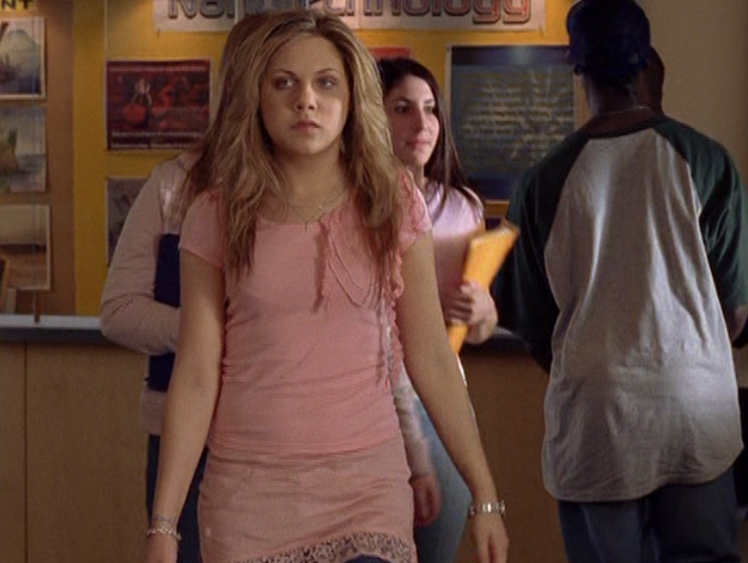 Ya know, I always think of Queen of Hearts as the Ellie + Alex episode, but it’s also quite big on Paige. I love how she looks in S4 – her hair, her grungy eye makeup. First she wears this tiny tee with a chihuahua on it. It looks like its name is “Chichi” lol. Next she’s at the movies with Matt. She wears casual flare cargo khakis, and ulta-low yellow cowl neck over a white shirt, and a random pink cowboy hat, which I kinda love. But in all actuality this outfit is pretty much awful. I mean, look at the size of those pockets on the khakis. Was she using those pants to smuggle food into the theatre? I guess, cuz ain’t nothing fitting into that mini purse. The next outfit, I love. It’s this gorgeous white off-shoulder top with flowers on it. Also, low rise janes and some kinda statement belt as per the 2000s requirements. And lastly, Paige wears her brown, scratchy work uniform and sneaks in a call on her flip phone.