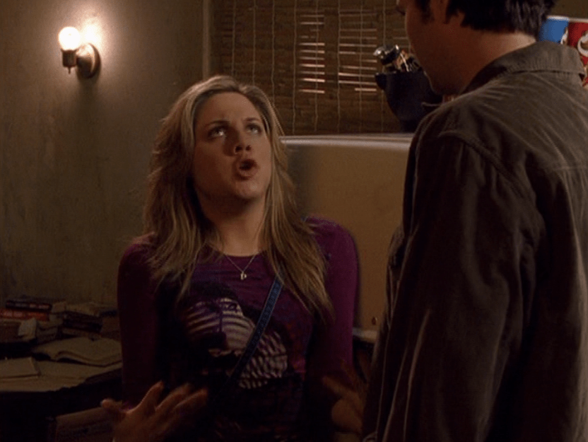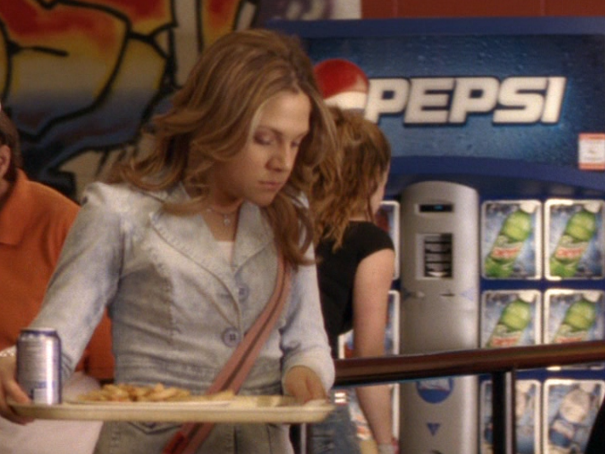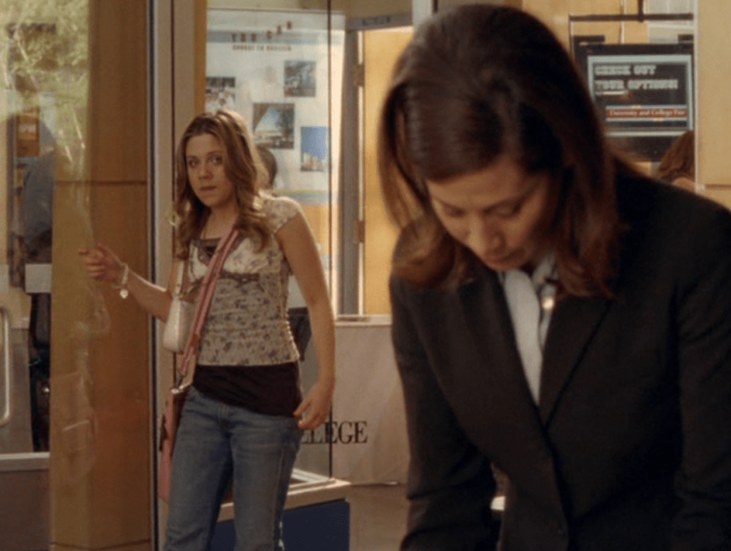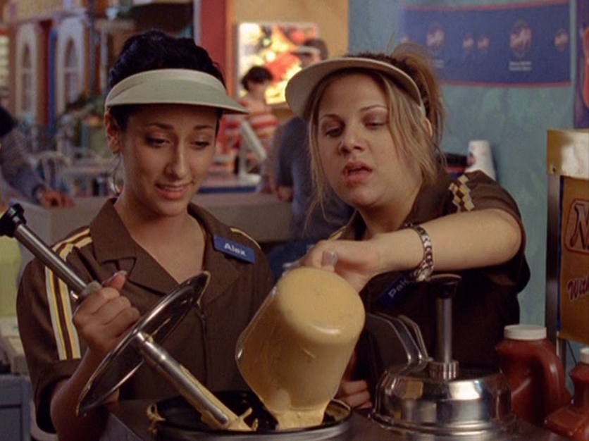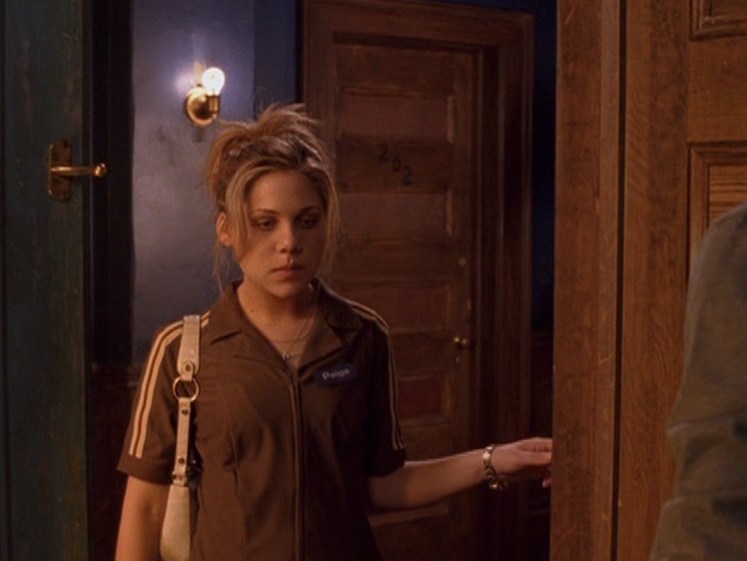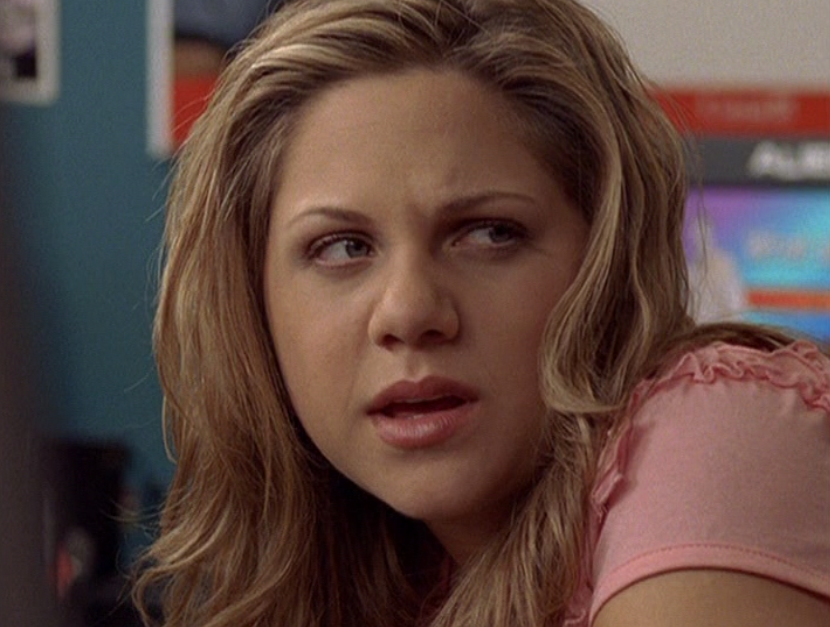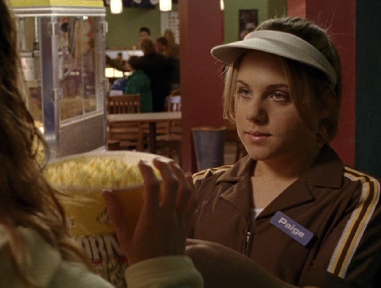 Ya know, I always think of Queen of Hearts as the Ellie + Alex episode, but it’s also quite big on Paige. I love how she looks in S4 – her hair, her grungy eye makeup. First she wears this tiny tee with a chihuahua on it. It looks like its name is “Chichi” lol. Next she’s at the movies with Matt. She wears casual flare cargo khakis, and ulta-low yellow cowl neck over a white shirt, and a random pink cowboy hat, which I kinda love. But in all actuality this outfit is pretty much awful. I mean, look at the size of those pockets on the khakis. Was she using those pants to smuggle food into the theatre? I guess, cuz ain’t nothing fitting into that mini purse. The next outfit, I love. It’s this gorgeous white off-shoulder top with flowers on it. Also, low rise janes and some kinda statement belt as per the 2000s requirements. And lastly, Paige wears her brown, scratchy work uniform and sneaks in a call on her flip phone.