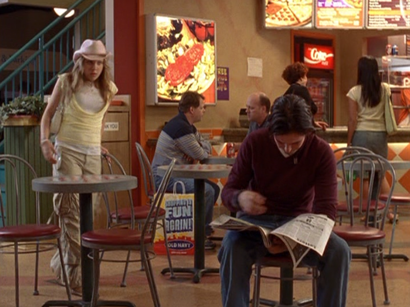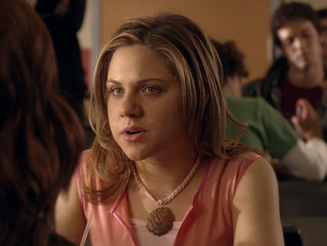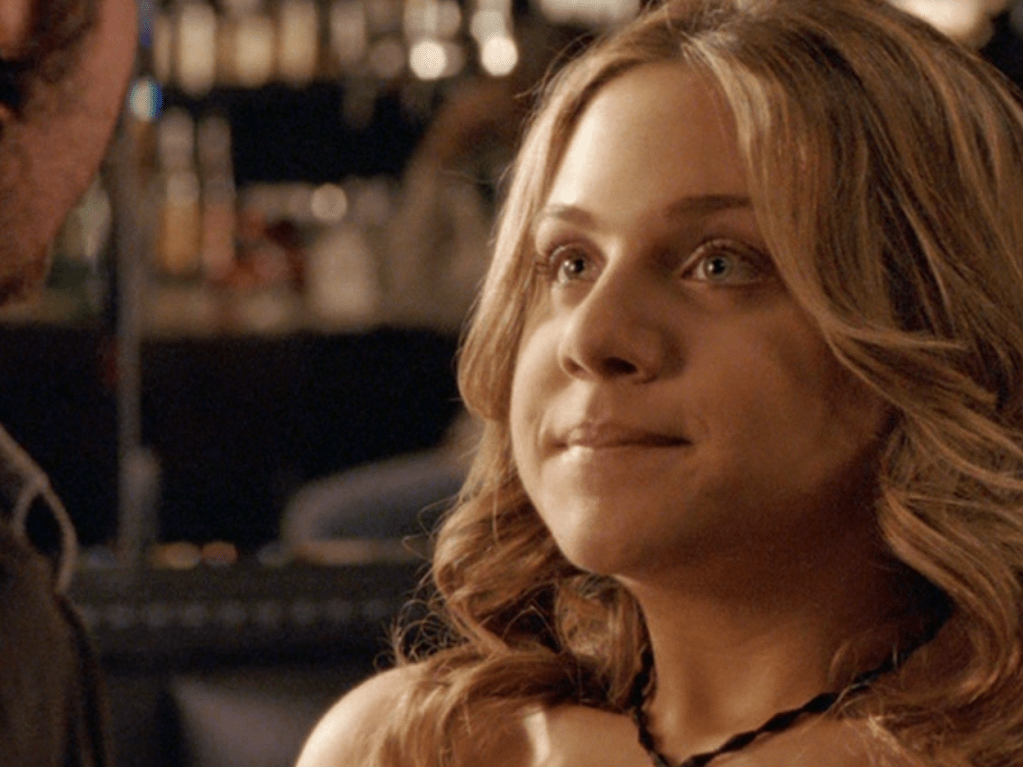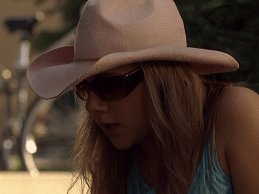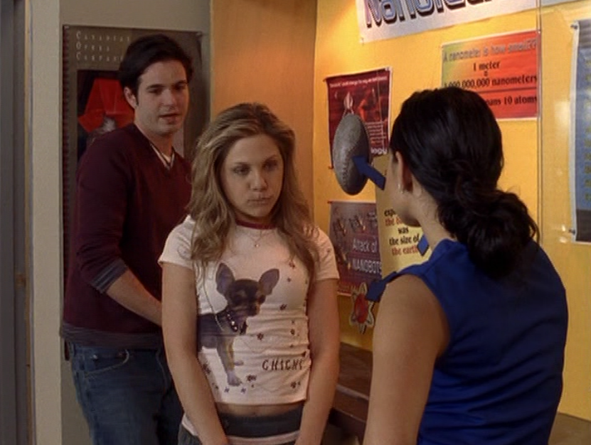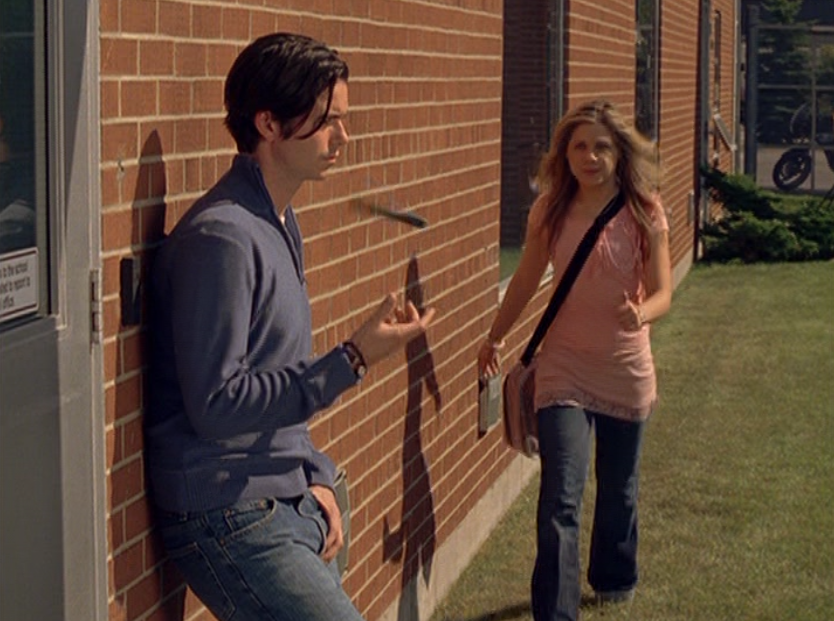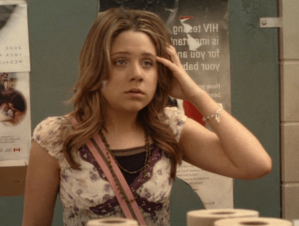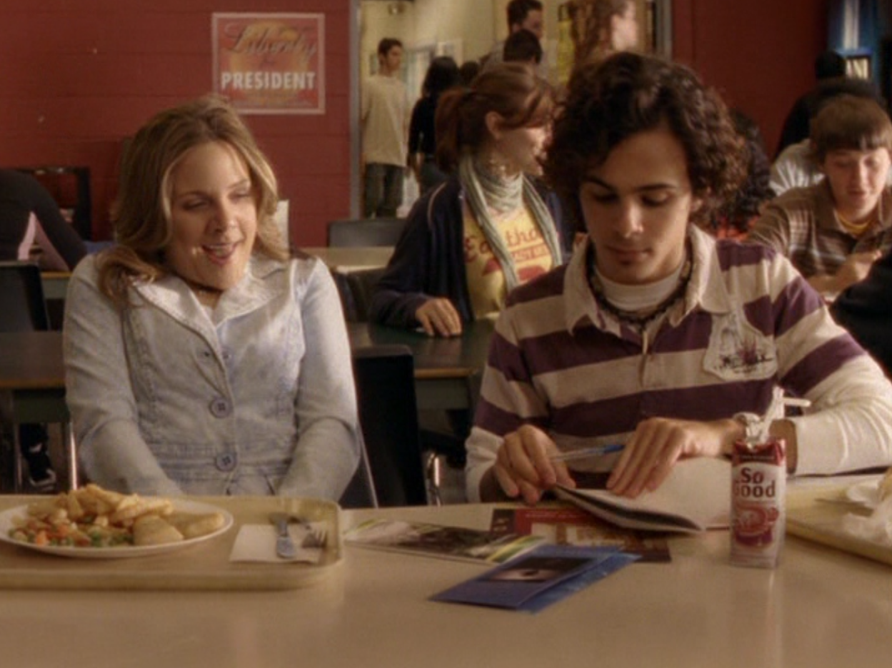 Ya know, I always think of Queen of Hearts as the Ellie + Alex episode, but it’s also quite big on Paige. I love how she looks in S4 – her hair, her grungy eye makeup. First she wears this tiny tee with a chihuahua on it. It looks like its name is “Chichi” lol. Next she’s at the movies with Matt. She wears casual flare cargo khakis, and ulta-low yellow cowl neck over a white shirt, and a random pink cowboy hat, which I kinda love. But in all actuality this outfit is pretty much awful. I mean, look at the size of those pockets on the khakis. Was she using those pants to smuggle food into the theatre? I guess, cuz ain’t nothing fitting into that mini purse. The next outfit, I love. It’s this gorgeous white off-shoulder top with flowers on it. Also, low rise janes and some kinda statement belt as per the 2000s requirements. And lastly, Paige wears her brown, scratchy work uniform and sneaks in a call on her flip phone.