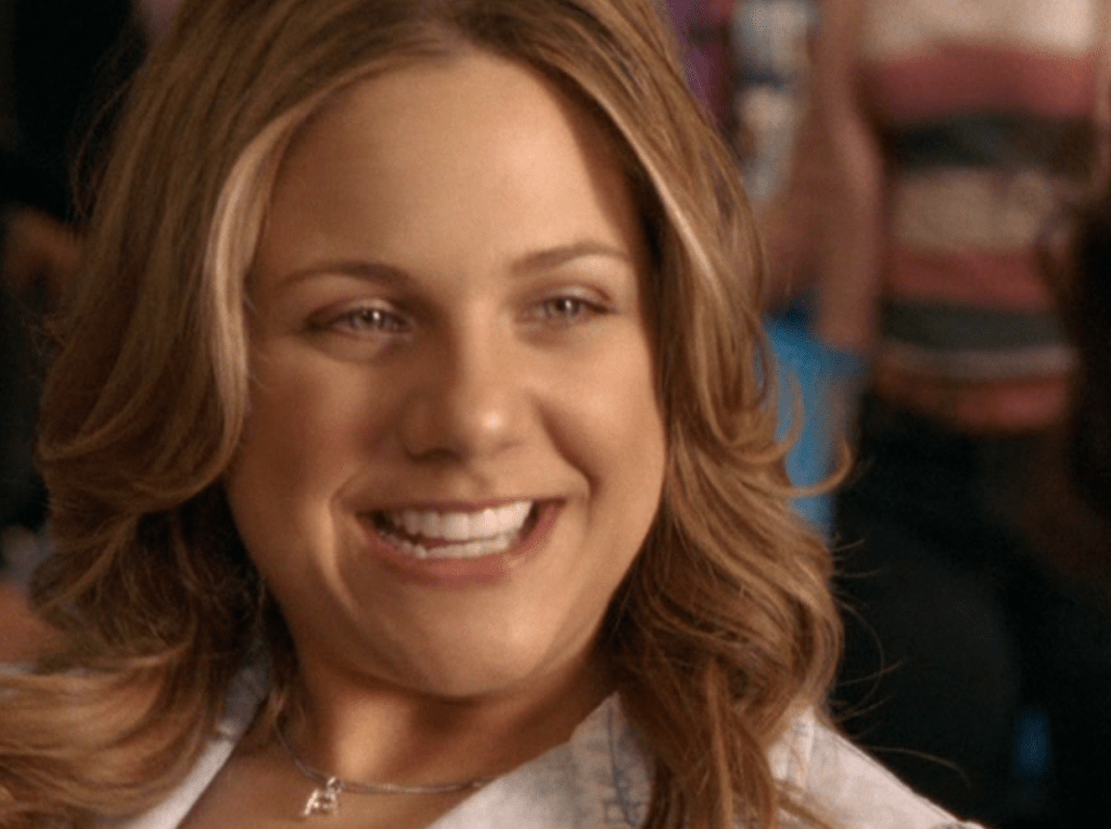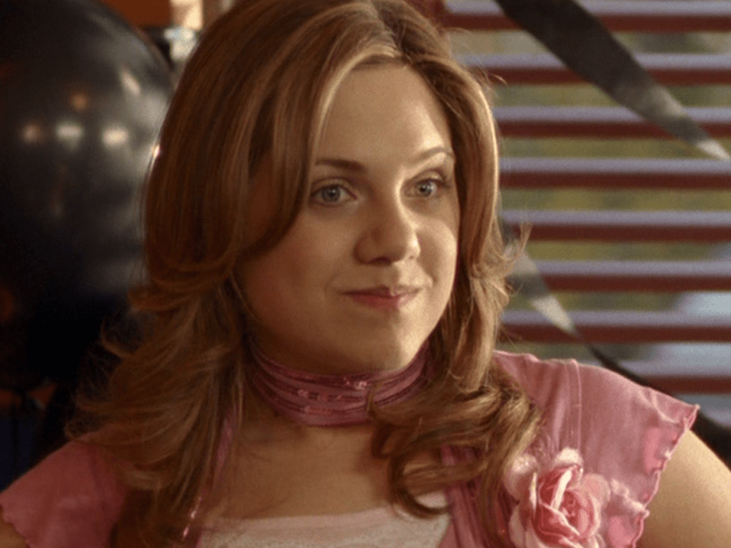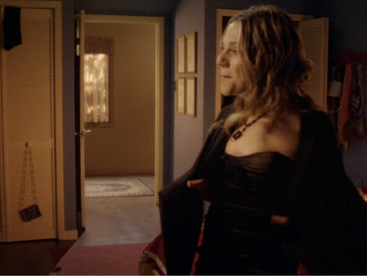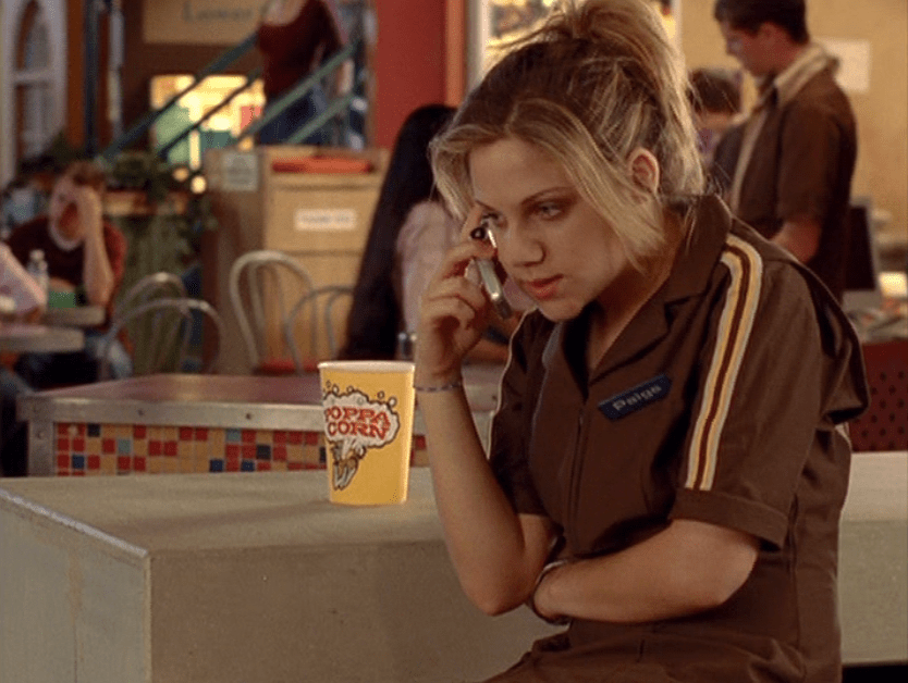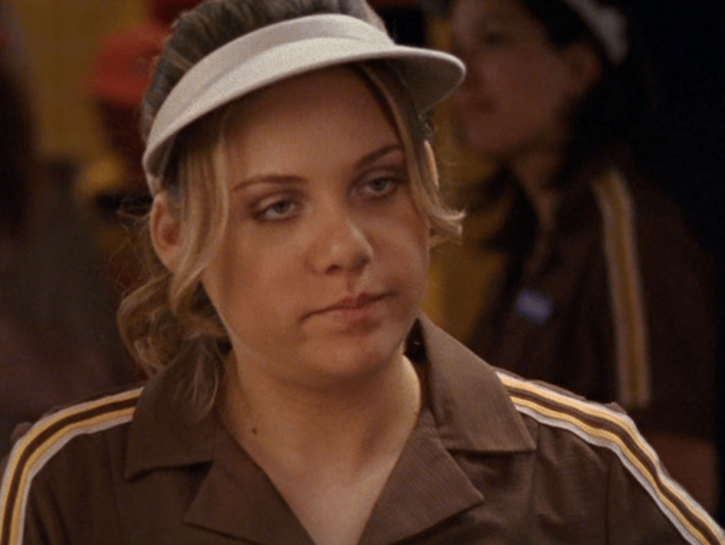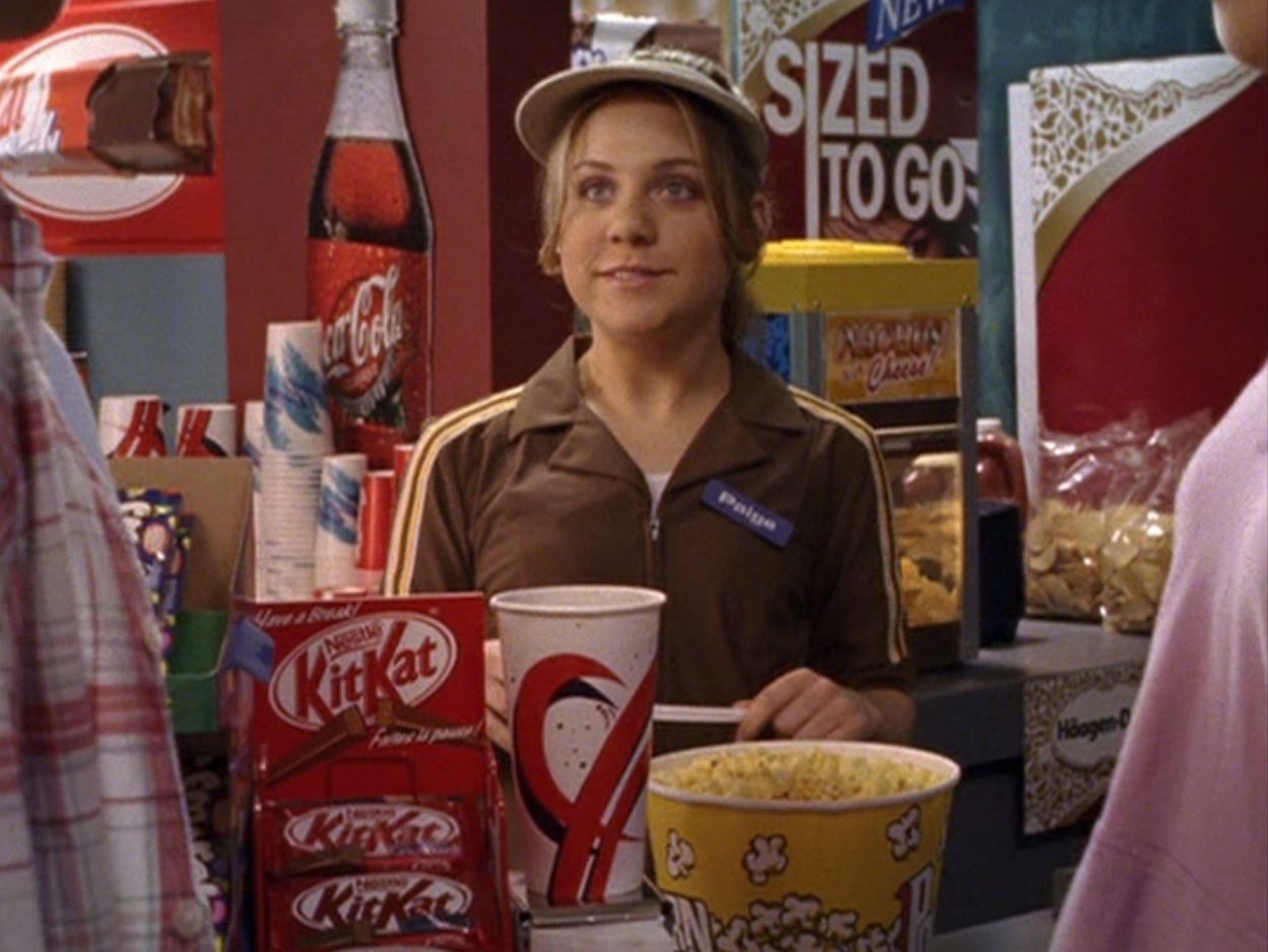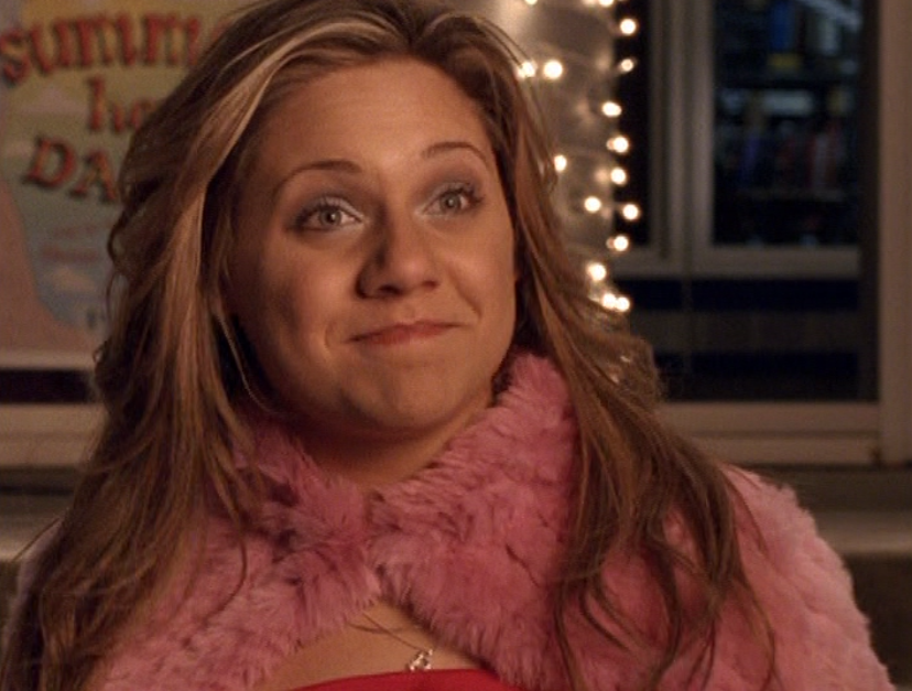 Ya know, I always think of Queen of Hearts as the Ellie + Alex episode, but it’s also quite big on Paige. I love how she looks in S4 – her hair, her grungy eye makeup. First she wears this tiny tee with a chihuahua on it. It looks like its name is “Chichi” lol. Next she’s at the movies with Matt. She wears casual flare cargo khakis, and ulta-low yellow cowl neck over a white shirt, and a random pink cowboy hat, which I kinda love. But in all actuality this outfit is pretty much awful. I mean, look at the size of those pockets on the khakis. Was she using those pants to smuggle food into the theatre? I guess, cuz ain’t nothing fitting into that mini purse. The next outfit, I love. It’s this gorgeous white off-shoulder top with flowers on it. Also, low rise janes and some kinda statement belt as per the 2000s requirements. And lastly, Paige wears her brown, scratchy work uniform and sneaks in a call on her flip phone.