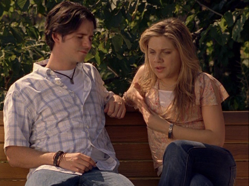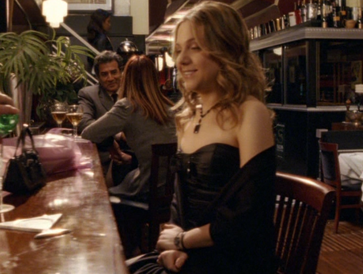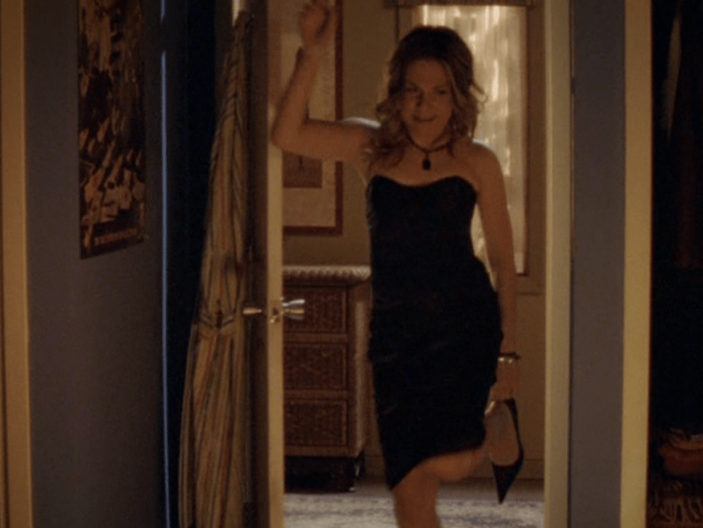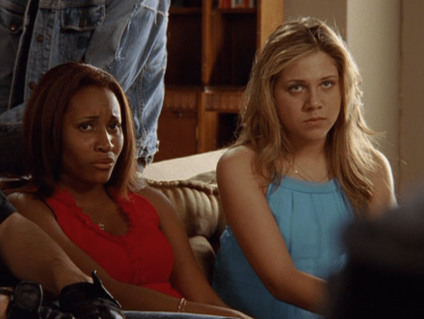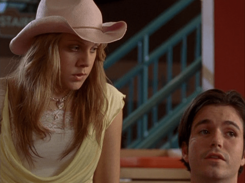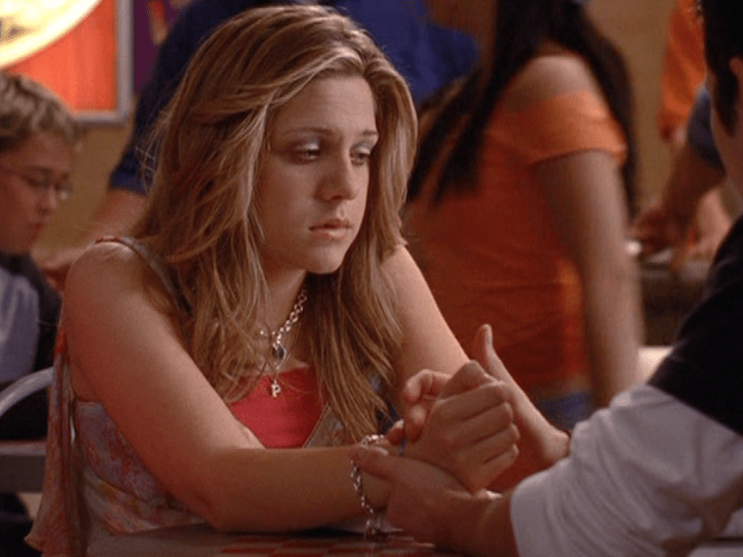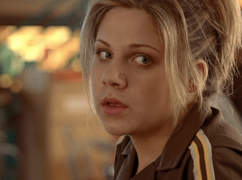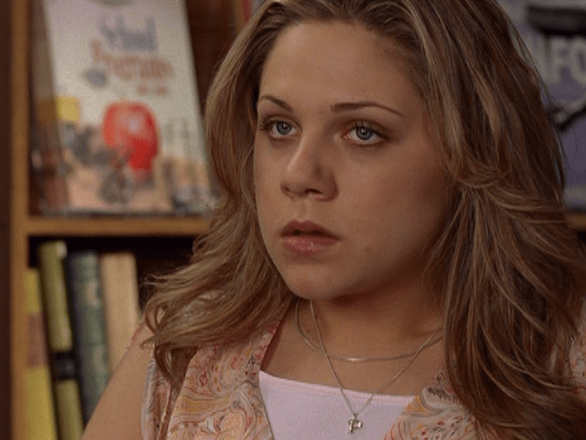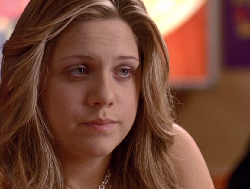 Ya know, I always think of Queen of Hearts as the Ellie + Alex episode, but it’s also quite big on Paige. I love how she looks in S4 – her hair, her grungy eye makeup. First she wears this tiny tee with a chihuahua on it. It looks like its name is “Chichi” lol. Next she’s at the movies with Matt. She wears casual flare cargo khakis, and ulta-low yellow cowl neck over a white shirt, and a random pink cowboy hat, which I kinda love. But in all actuality this outfit is pretty much awful. I mean, look at the size of those pockets on the khakis. Was she using those pants to smuggle food into the theatre? I guess, cuz ain’t nothing fitting into that mini purse. The next outfit, I love. It’s this gorgeous white off-shoulder top with flowers on it. Also, low rise janes and some kinda statement belt as per the 2000s requirements. And lastly, Paige wears her brown, scratchy work uniform and sneaks in a call on her flip phone.