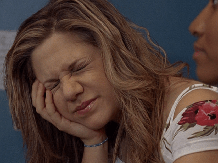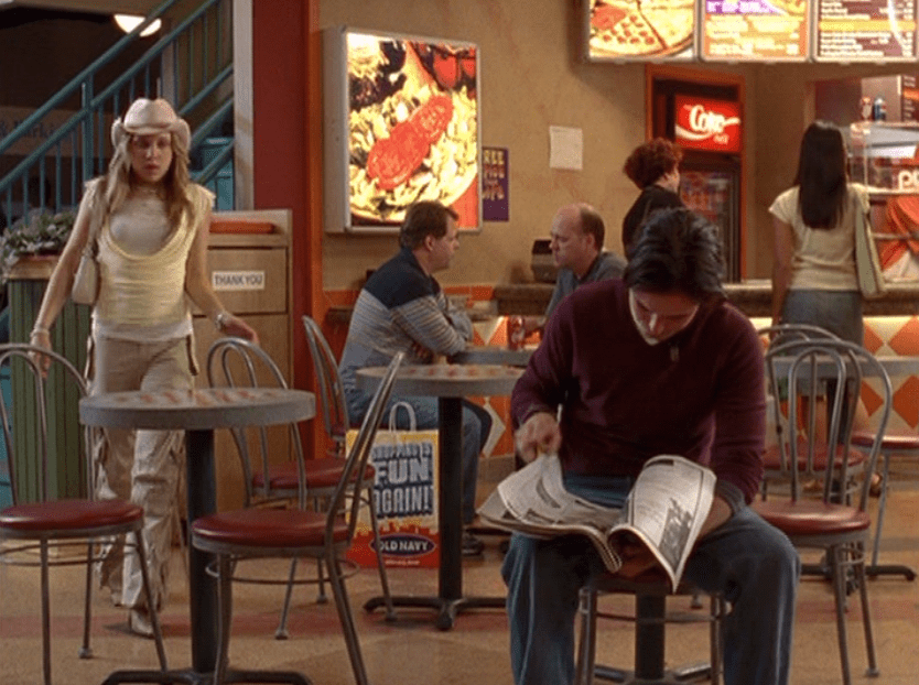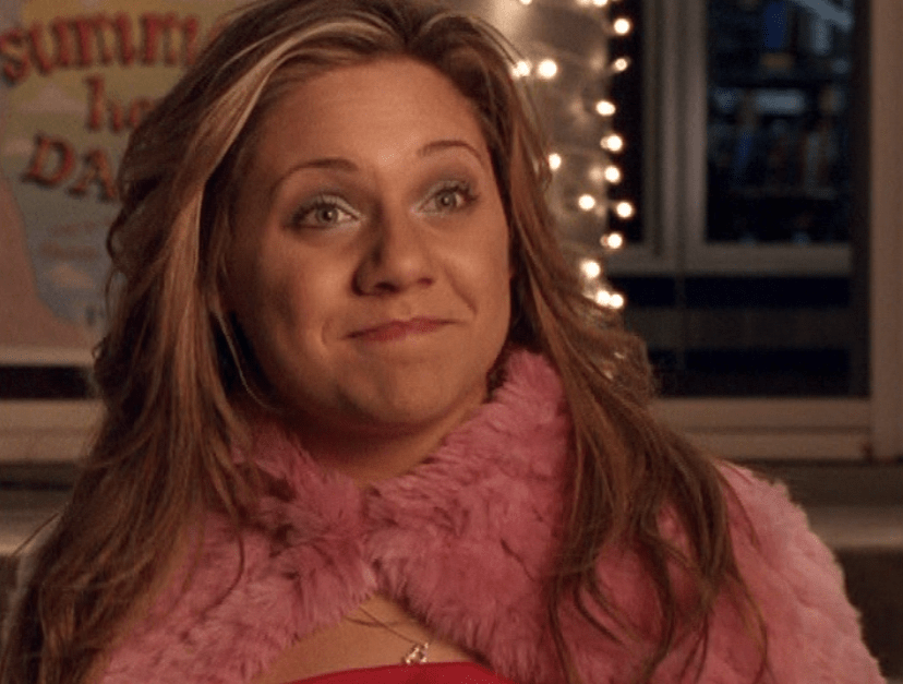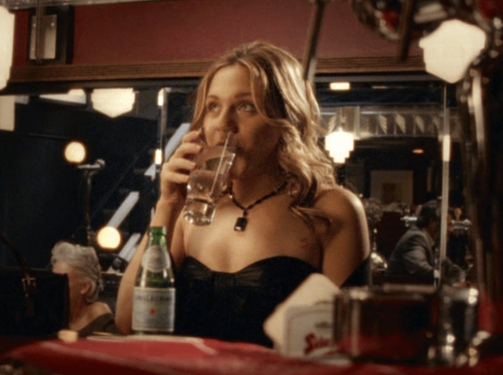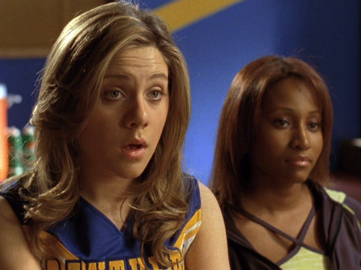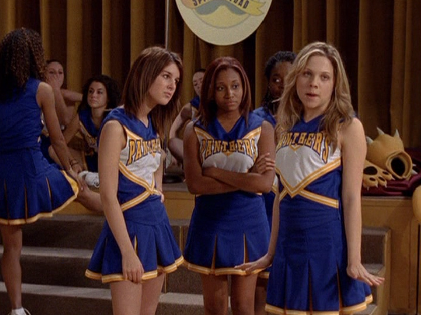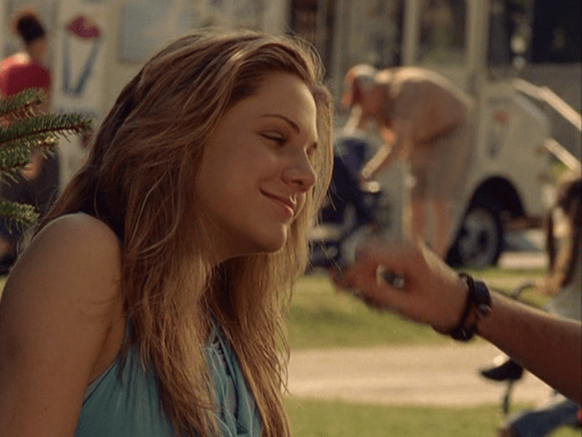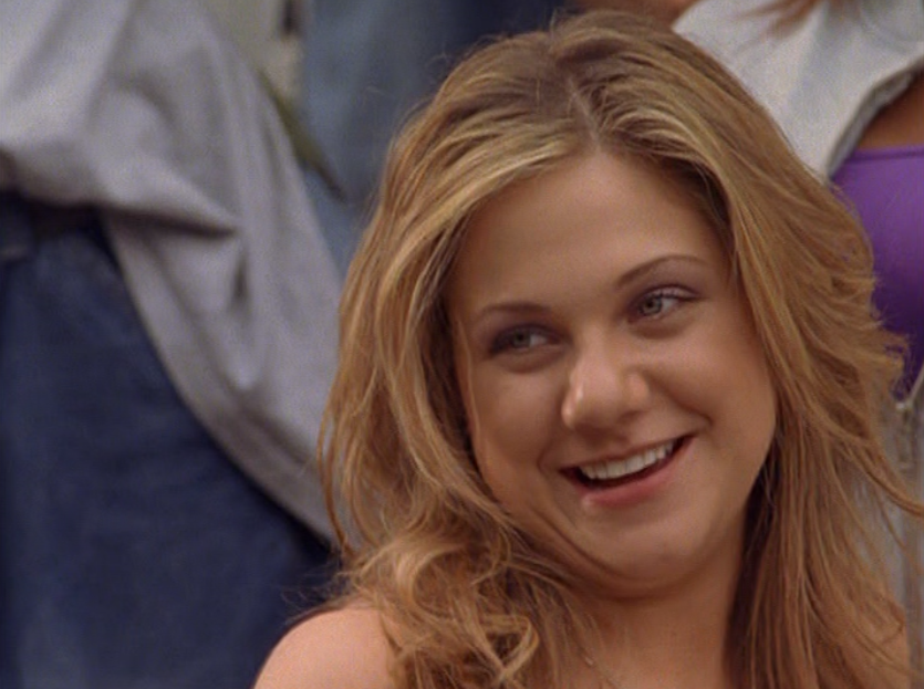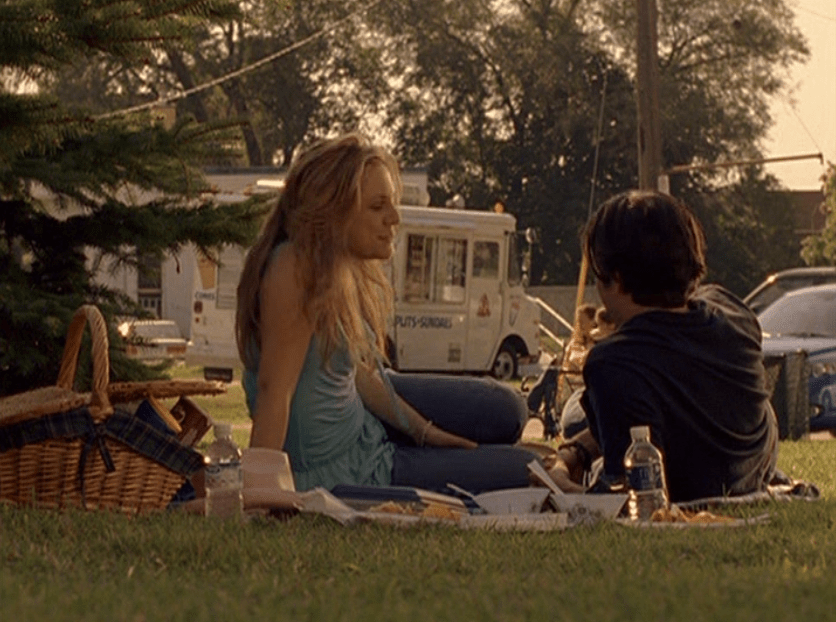 Ya know, I always think of Queen of Hearts as the Ellie + Alex episode, but it’s also quite big on Paige. I love how she looks in S4 – her hair, her grungy eye makeup. First she wears this tiny tee with a chihuahua on it. It looks like its name is “Chichi” lol. Next she’s at the movies with Matt. She wears casual flare cargo khakis, and ulta-low yellow cowl neck over a white shirt, and a random pink cowboy hat, which I kinda love. But in all actuality this outfit is pretty much awful. I mean, look at the size of those pockets on the khakis. Was she using those pants to smuggle food into the theatre? I guess, cuz ain’t nothing fitting into that mini purse. The next outfit, I love. It’s this gorgeous white off-shoulder top with flowers on it. Also, low rise janes and some kinda statement belt as per the 2000s requirements. And lastly, Paige wears her brown, scratchy work uniform and sneaks in a call on her flip phone.
