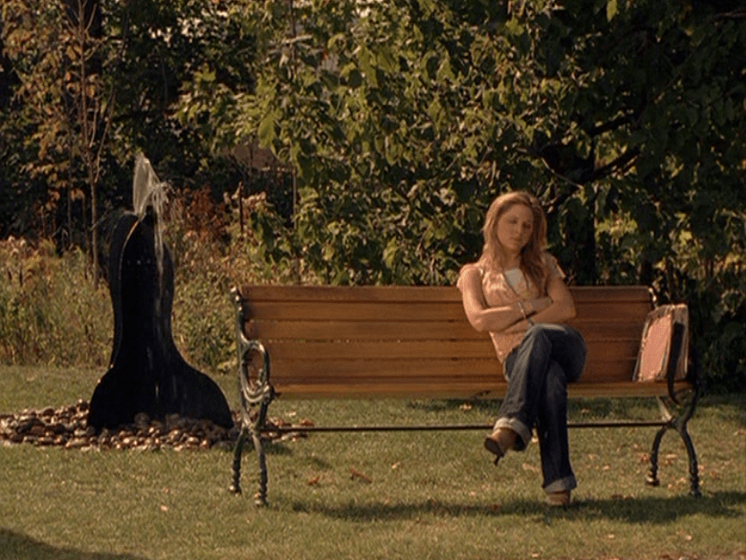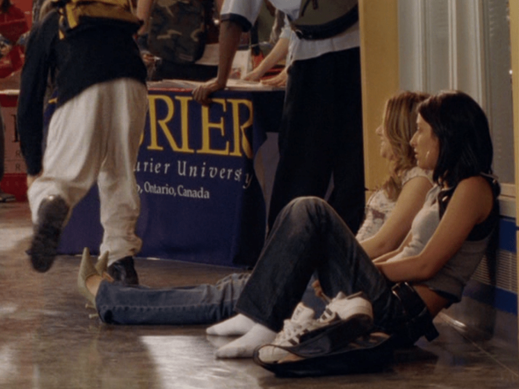 Next, on the steps of Degrassi, Paige is wearing layers again – a floral blouse layered over a longer cami – that was such a thing. And some flare jeans, with some pointy-toe shoes that look way too uncomfortable for school. This is where she gets high with Alex before the college fair. I think this is arguably a pretty accurate representation of getting high. It’s hard to explain and hard to portray, especially since it seems to be a different experience for everyone, but I really like how they did it here in this episode.