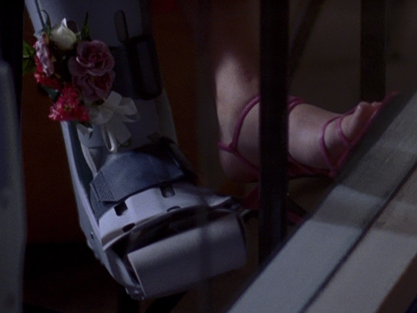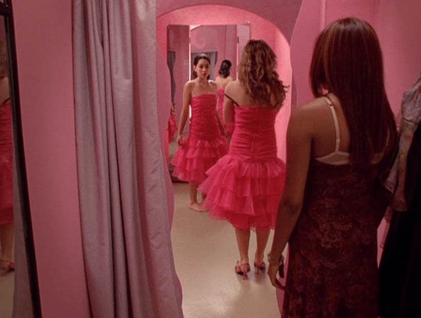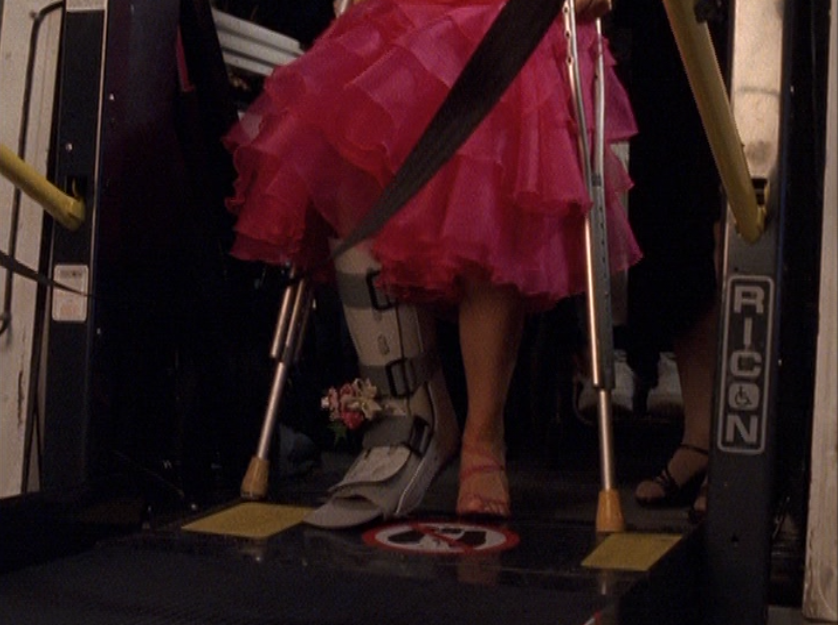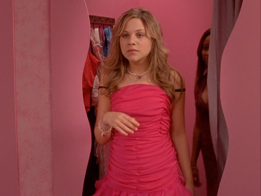West End Girls being the Manny vs. Paige episode means we get a good helping of Paige. And Paige in pink is just me favorite! First she’s seen at Spirit Squad, forgetting the dance routine. Notice her super grunge-looking eye makeup. I guess it’s better likened to raccoon eyes given the era though. Next she’s seen at the store Pretty Pretty Pretty or whatever, trying on that gorgeous dress with her big black bra straps hanging out. I’ll say it again, this cropped length is a really weird pairing with a dropped waist. Next we see her with Matt wearing a very Paige-y top, silver jewelry, and frosty makeup. And even with a broken leg, Paige won’t miss that dance. She clomps on in, corsage in her boot, raging on pain killers. She wears a cute pink furry bolero with the dress, and one strappy pink heel.