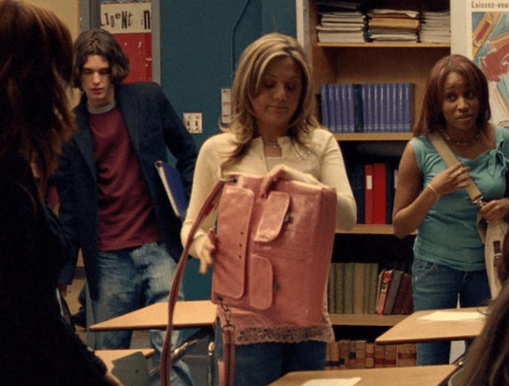 Paige is here in this episode to shun Ellie, and then to shun Manny. lol. She’s wearing this peachy-corally top layered over a cami and a medallion necklace. After a brief cheer uniform moments, we see her in this hilarious mini cardi. Yes, that’s such a 2000s thing. I had mini cardis like this one. She’s got it layered over a long pink cami. Also her regular pink bag is pictured here.