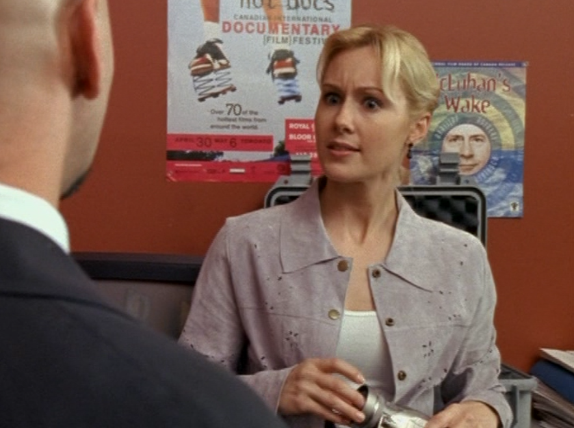 Caitlin has those flipped-out layers in her hair that were quite popular in the early 2000s. She’s also talking about how she HATES to see herself on camera, and I’m not buying that. Anyway, first she’s in a patterned blouse and then she’s in a ribbed lavender turtleneck.