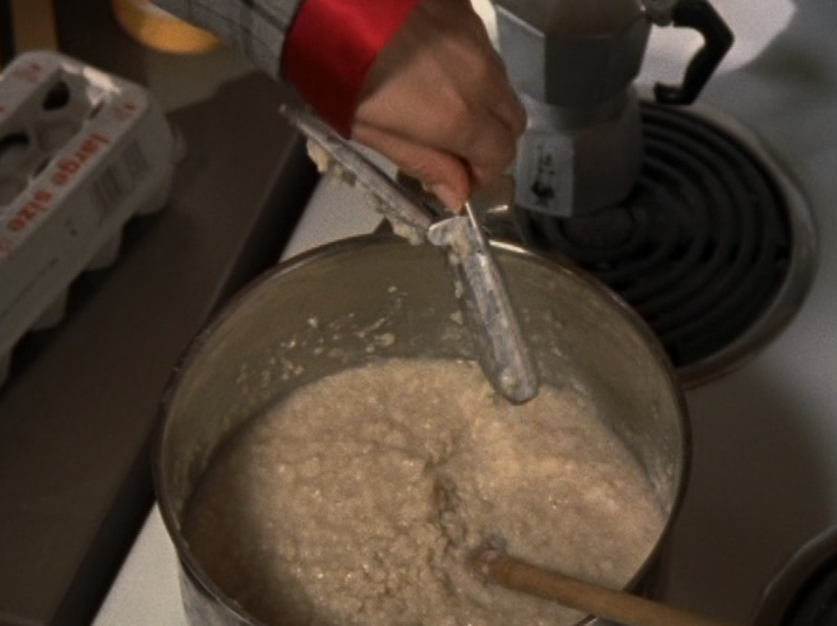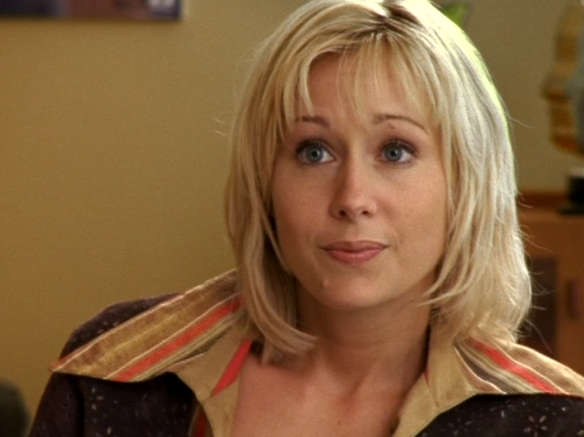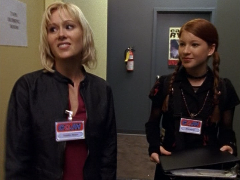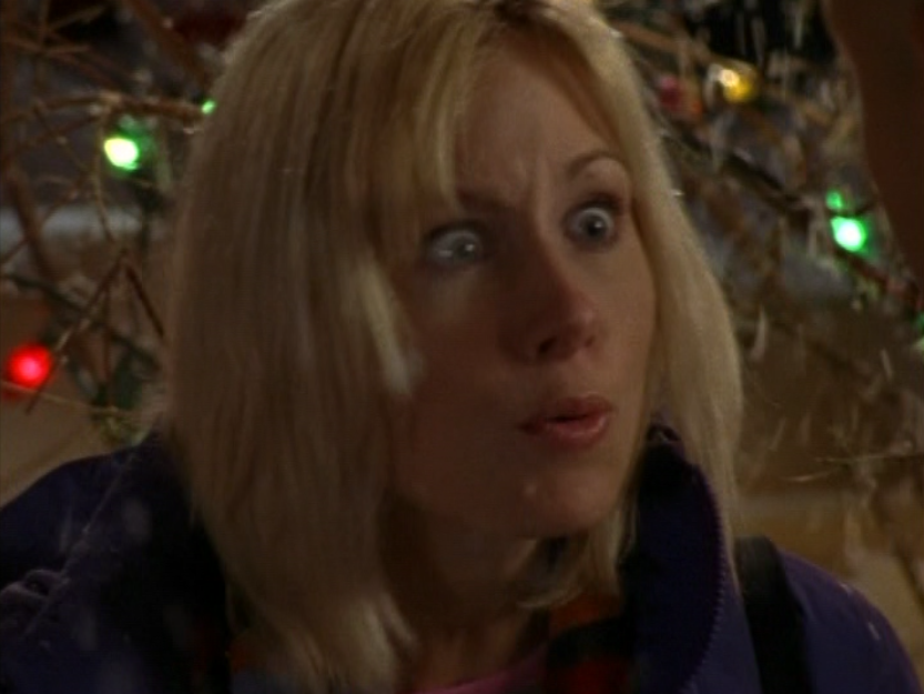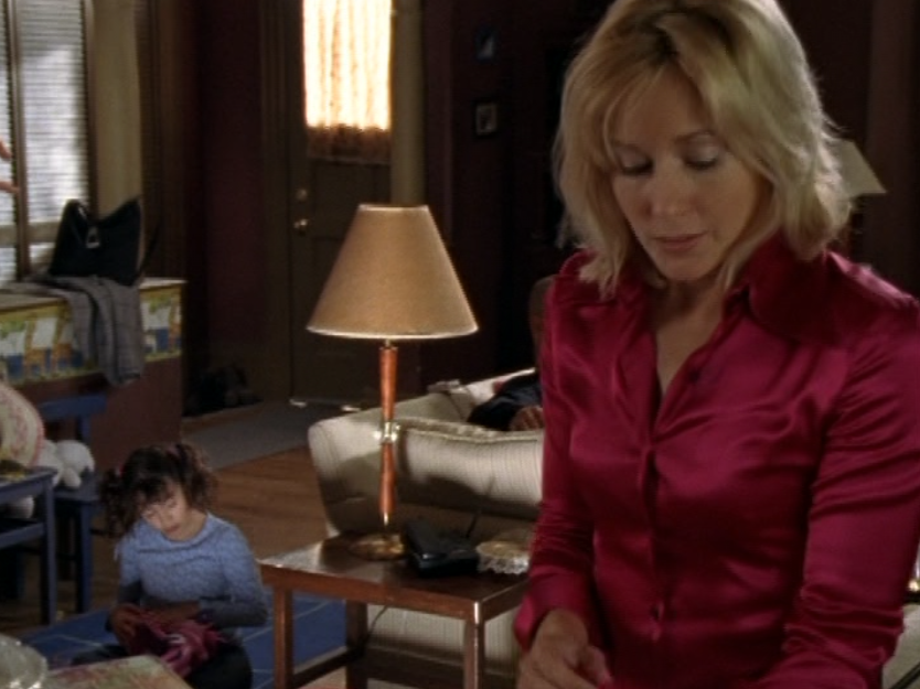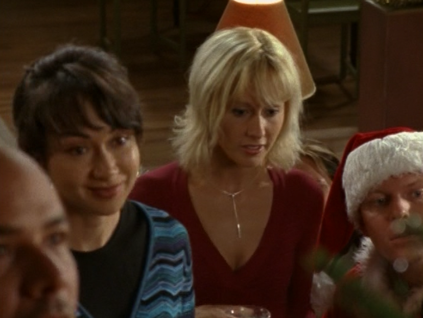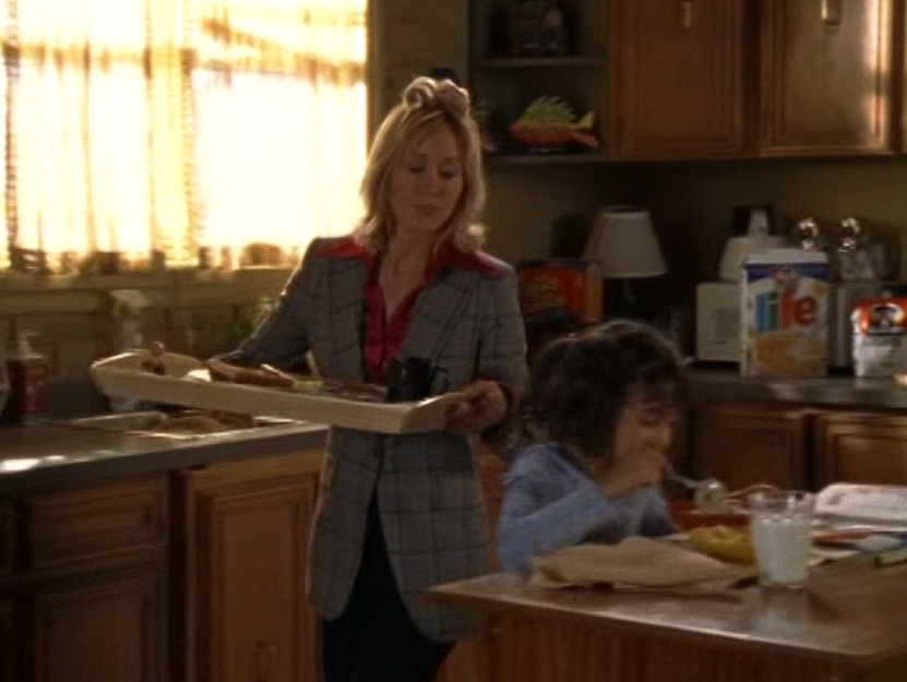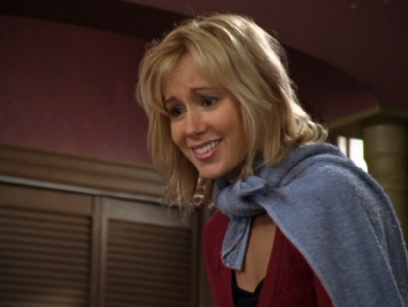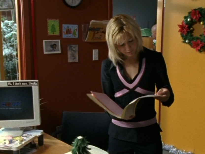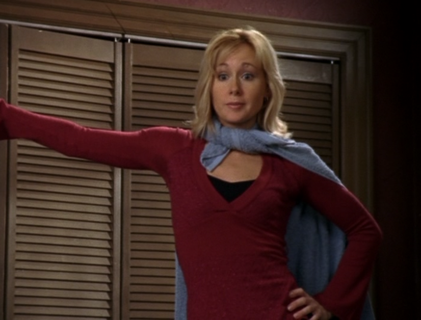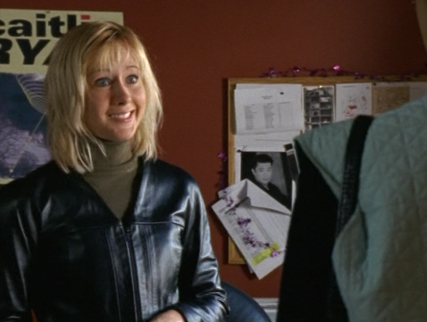I don’t know why, but Caitlin’s lack of confidence is just, strange to me? I feel like she shouldn’t be so wimpy at this point in life. So yeah in this episode she’s weirdly lingering around Joey’s family, and unfortunately Sydney makes it worse by making Caitlin a babysitter, further entwining her with their family. Anyway, she’s first at the tree-trimming party in a red v-neck, sporting that bleach blonde textured haircut. Then, she’s late for Angie’s… recital? What is the word I’m looking for? In a blue puff jacket and a striped scarf. Next, she’s again, lingering at Joey’s house, in a purple horizontal-striped shirt. Then her best bud Sydney comes to see her at work. She’s wearing a turtleneck and a zip-up leather jacket. Sometimes in the 2000s, we were lost. Lost between the 90s and the future and unsure of what looks good. And finally, she’s doing the babysitting in a grey and pink raglan tee.