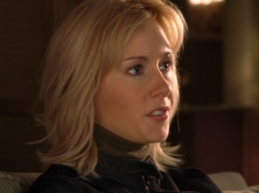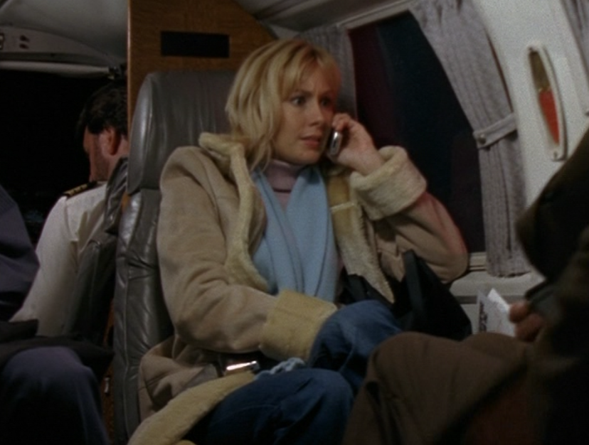 Yay, Caitlin is here for Spike’s wedding! First she wears flare jeans and a form-fitting tan corduroy jacket over a maroon tee. We also need to talk about her hair. This was one of the hairstyles of the time – it’s fully colored, no highlight/lowlight/roots, etc, just flat out blonde. And not just any blonde, it’s that golden blonde – what I like to call Playboy blonde. I’m a fan, but I want you to look around and observe. If your location is anything like mine, we currently aren’t seeing a lot of yellow-blonde lately. Right now it’s all about the silvery ash blonde. Interesting how things change.