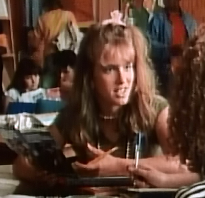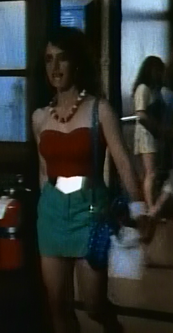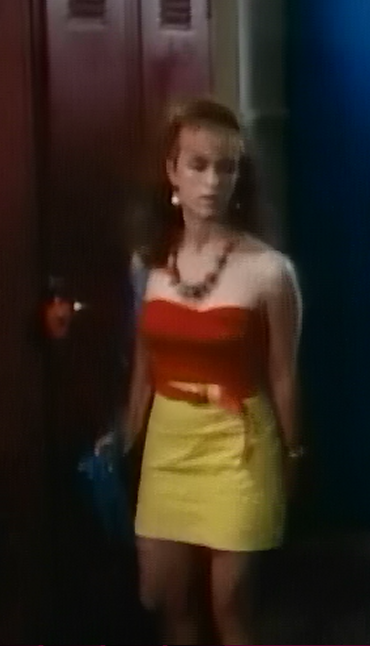 Alright, she’s back at it, wearing RED, the color of mad, passionate, true love. She’s not playing around in this red tube top, yellow miniskirt, red belt, colorful chunky necklace, pearl earrings, and red high heels.