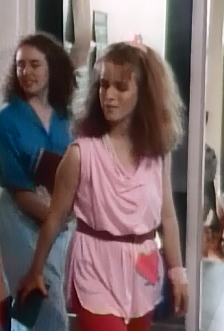 And the only way I can really describe this look is “playful”. because it really does appear that Steph is a little girl playing dress up. She’s got this pink drape-neck tunic on, with a dark belt and some sort of heart on it. She accessorizes with pearls and a pink hair clip. And those hot pink tights – she means business today, because she only wears those tights on special occasions.