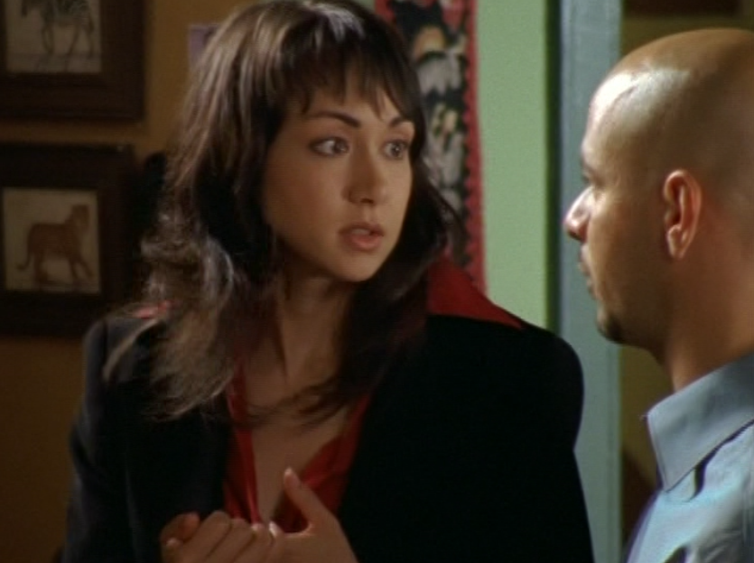 Syd wears a red blouse, black blazer, and sports a shaggy cut. Love the bangs! We don’t see much of her because she and Joey are just dropping off dinner for Snake. I’m sure it was Sydney’s idea.